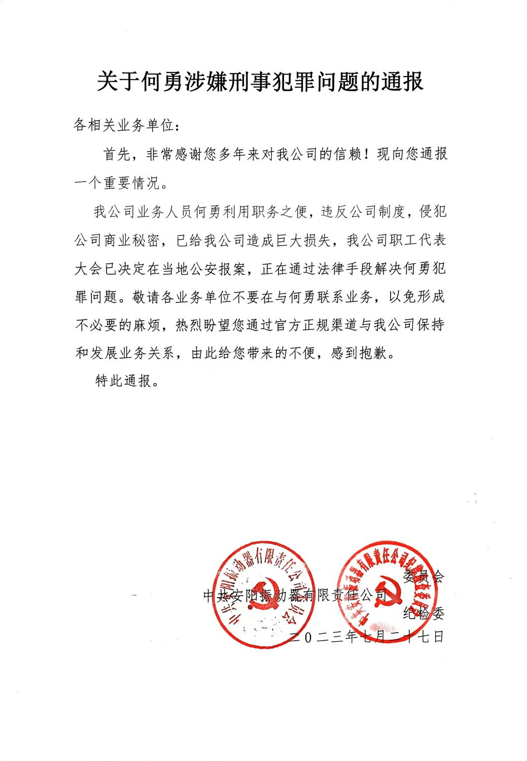 我公司業(yè)務(wù)人員何勇利用職務(wù)之便,違反公司制度,侵犯公司商業(yè)秘密,已給我公司造成巨大損失,我公司職工代表大會已決定在當(dāng)?shù)毓矆蟀?,正在通過法律手段解決何勇犯罪問題。敬請各業(yè)務(wù)單位不要在與何勇聯(lián)系業(yè)務(wù),以免形成不必要的麻煩,熱烈盼望您通過官方正規(guī)渠道與我公司保持和發(fā)展業(yè)務(wù)關(guān)系,由此給您帶來的不便,感到抱歉。